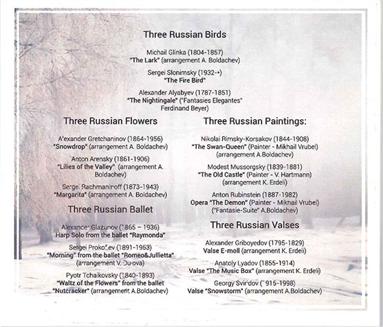| 収録内容 | ロシアの3羽の鳥 ひばり (ミカエル・グリンカ) 火の鳥 (セルゲイ・スロニンスキー) ナイチンゲール(アレクサンダー・アリャ―ビエフ) ロシアの3つの花 雪だるま (アレクサンドル・グレチャニノフ) ユリの谷 (アントン・アレンスキー) ひなぎく (セルゲイ・ラフマニノフ) 3つのロシア・バレエ曲 ハープソロ バレエ「ライモンダ」より(アレクサンダー・グラズノフ) 朝 バレエ「ロミオとジュリエット」(セルゲイ・プロコフィエフ) 花のワルツ バレエ「くるみ割り人形」(ピョートル・チャイコフスキー) 3つのロシアの絵画 白鳥の女王 (ニコライ・リムスキー=コルサコフ) 古城 (モデスト・ムソルグスキー) 悪魔 (アントン・ルビンシテイン) ロシアの3つのワルツ ワルツ ホ短調 (アレクサンドル・グリボエードフ) ワルツ おどけたワルツ (アナト-リ・リャードフ) ワルツ 吹雪 (ゲオルギー・スヴィリドフ) |