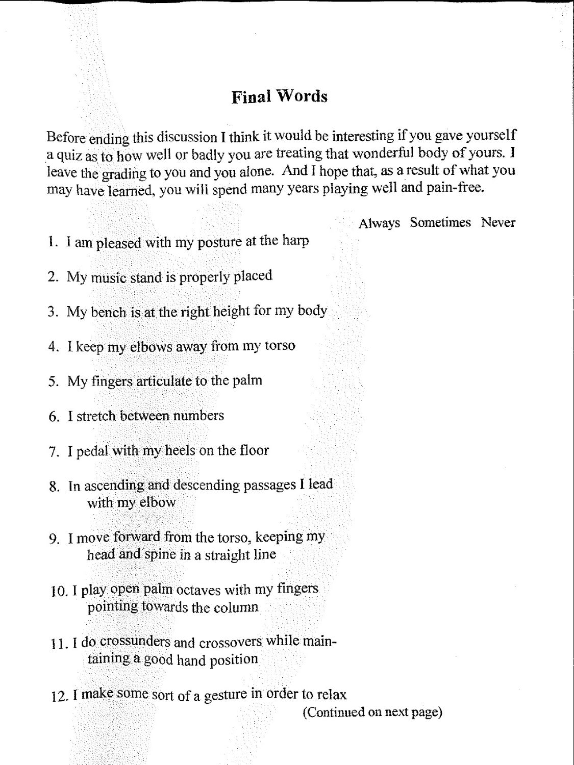 テーマには、ハープの前に正しく座る方法、胴体、腕、手、指の正しい使い方、ハープと機材の動かし方、痛みの対処法、体力と持久力を高めるための運動方法などが含まれます。