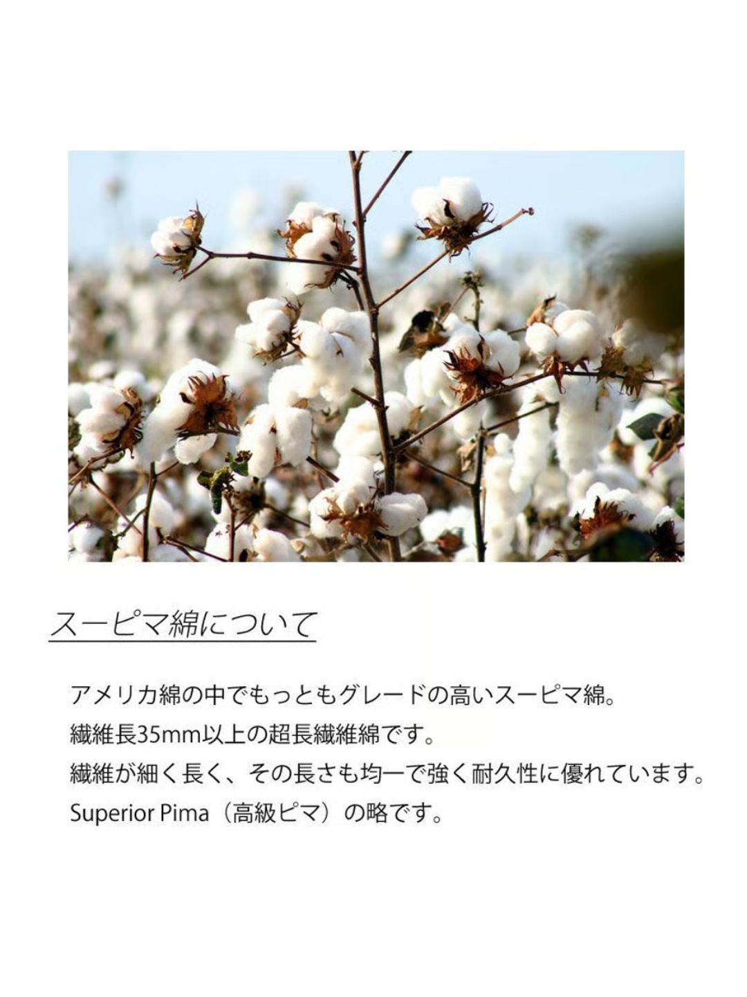 コットンは繊維長が長いものほど高級とされており、アメリカ産で最高級の品質を誇るのがピマ・コットンで、「スーピマ」は、Superior pima(高級ピマ)の略で、米国スーピマ協会の登録商標にもなっています。